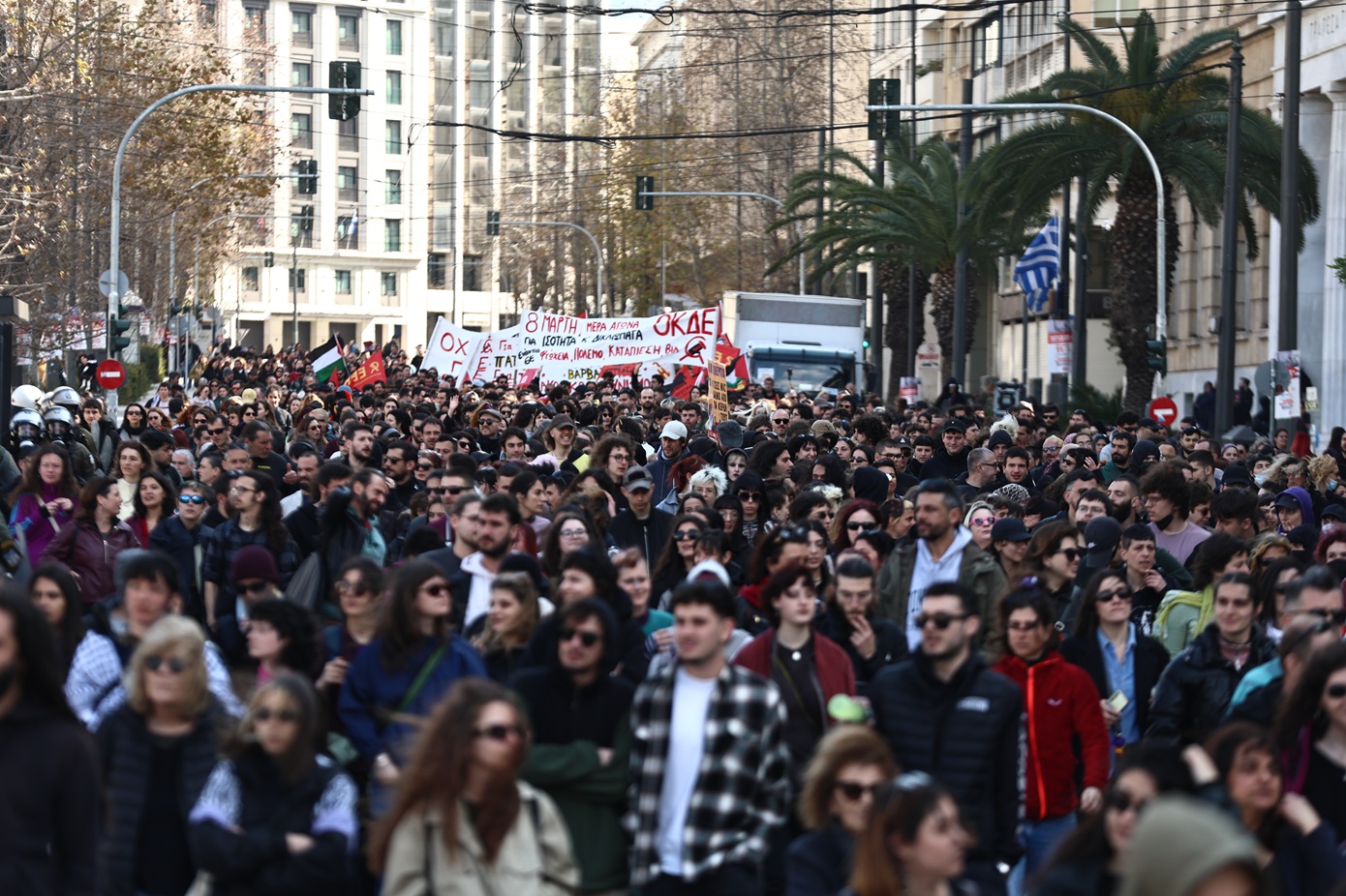 Οι προσυγκεντρώσεις έγιναν στη Σταδίου η οποία «πλημμύρισε» από διαδηλώτριες και διαδηλωτές.