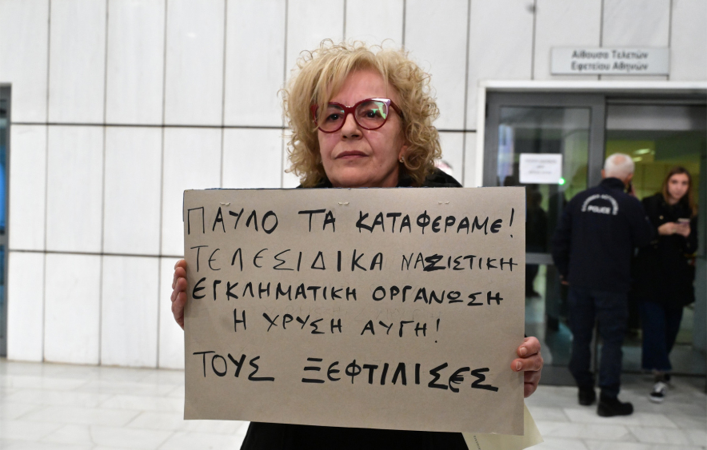Στα χέρια της, η Μάγδα Φύσσα κρατούσε ένα χαρτί που έγραφε: «Παύλο τα καταφέραμε! Τελεσίδικα ναζιστική εγκληματική οργάνωση η Χρυσή Αυγή! Τους ξεφτίλισες».