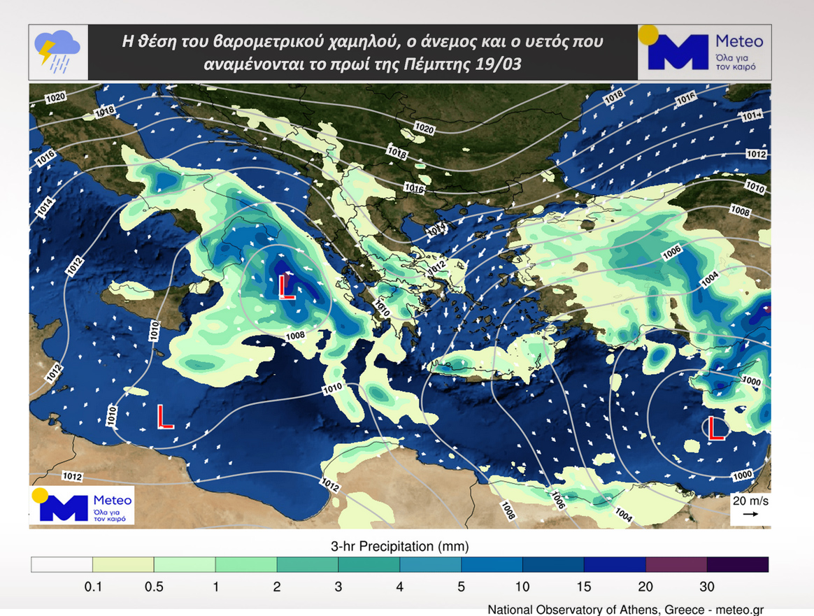 Την Πέμπτη 19/03 βροχές αναμένονται κυρίως στη Δυτική Μακεδονία, στα κεντρικά και νότια ηπειρωτικά, στο Ιόνιο, στο Αιγαίο και στην Κρήτη ενώ πιθανότητα καταιγίδων υπάρχει κυρίως για το Νότιο Ιόνιο και τα δυτικά της Πελοποννήσου. Χιονοπτώσεις θα εκδηλωθούν σε ορεινές περιοχές των προαναφερθέντων ηπειρωτικών.