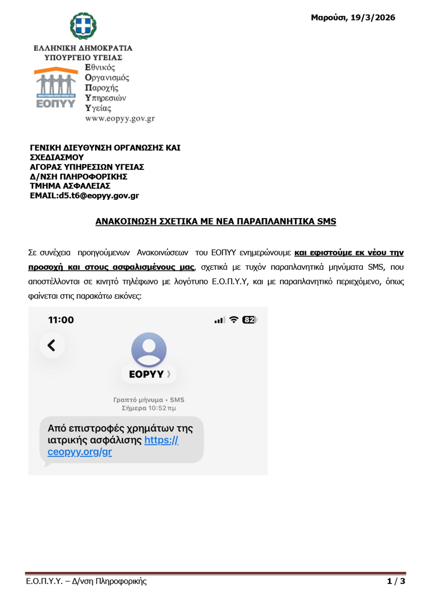 1. Αποστολέας: Η διεύθυνση email του αποστολέα δεν είναι επίσημη του ΕΟΠΥΥ. Οι πραγματικές διευθύνσεις e-mail του ΕΟΠΥΥ τελειώνουν σε