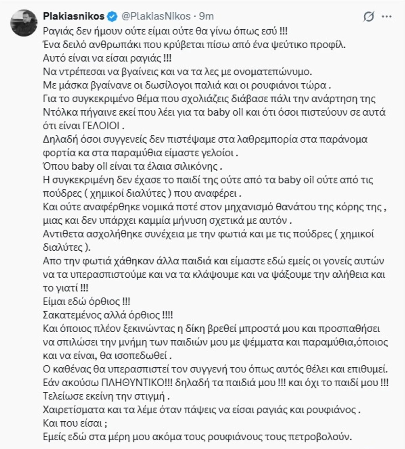 Με μια οργισμένη ανάρτηση-απάντηση σε ανώνυμο λογαριασμό, αλλά με πολλούς αποδέκτες, ο Νίκος Πλακιάς λίγο πριν ξεκινήσει η δίκη των Τεμπών, διαμηνύει ότι όποιος προσπαθήσει να σπιλώσει τη μνήμη των παιδιών του με ψέματα και παραμύθια, «θα ισοπεδωθεί, όποιος και να είναι».