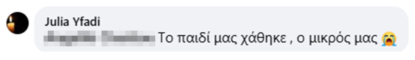 Με μια λιτή αλλά ιδιαίτερα συγκινητική ανάρτηση, αποχαιρέτησε τον γιο της, γράφοντας: «R. I. P. αγόρι μου», συνοδεύοντας τα λόγια αυτά με φωτογραφία του. Στο πλευρό της στάθηκαν άμεσα φίλοι και συγγενείς, εκφράζοντας τη συμπαράστασή τους, με την ίδια να απαντά σε ένα από τα μηνύματα: «Το παιδί μας χάθηκε…», αποτυπώνοντας τη συντριβή που βιώνει η οικογένεια.