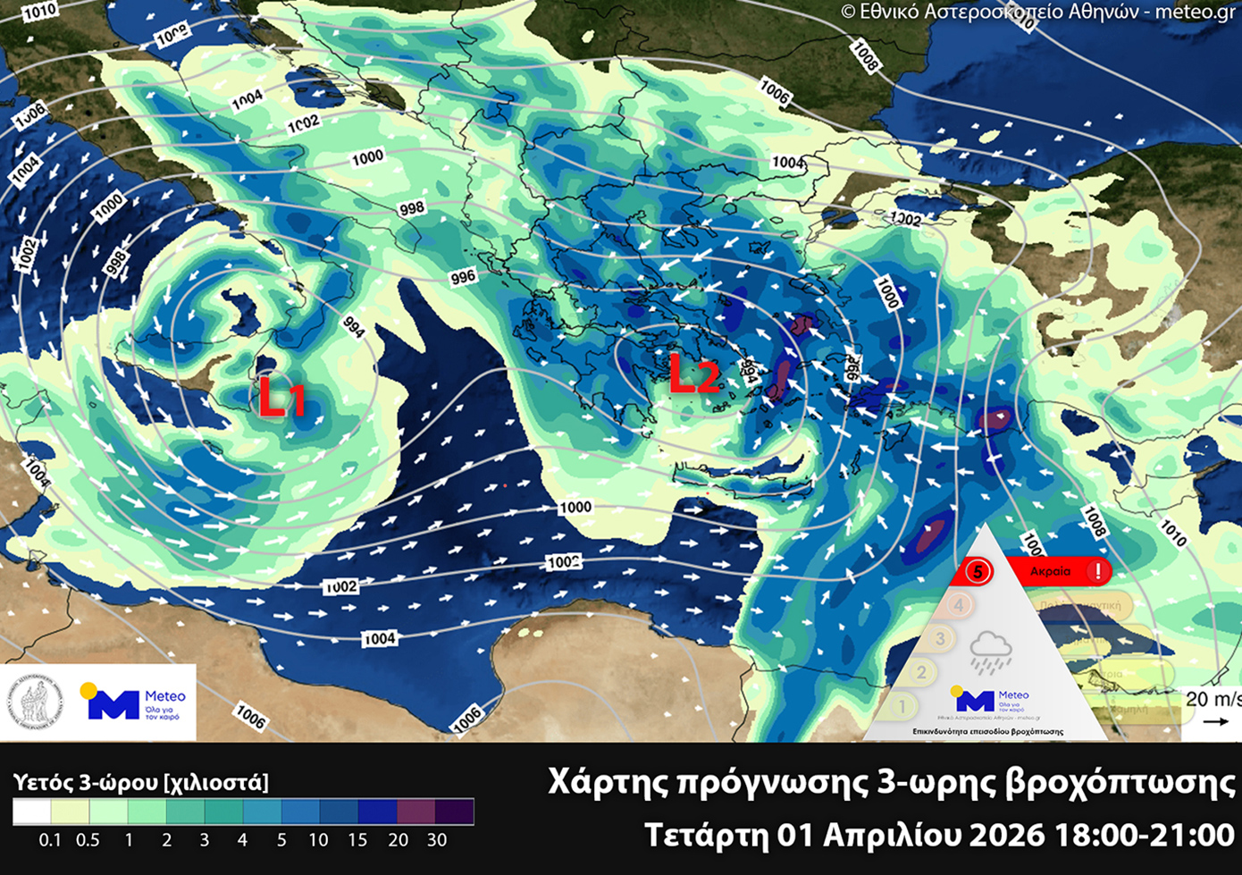 Στον παρακάτω χάρτη παρουσιάζεται ο αθροιστικός υετός 3-ώρου και τα πεδία πιέσεων κατά το διάστημα 18:00 – 21:00 της Τετάρτης 01 Απριλίου 2026: