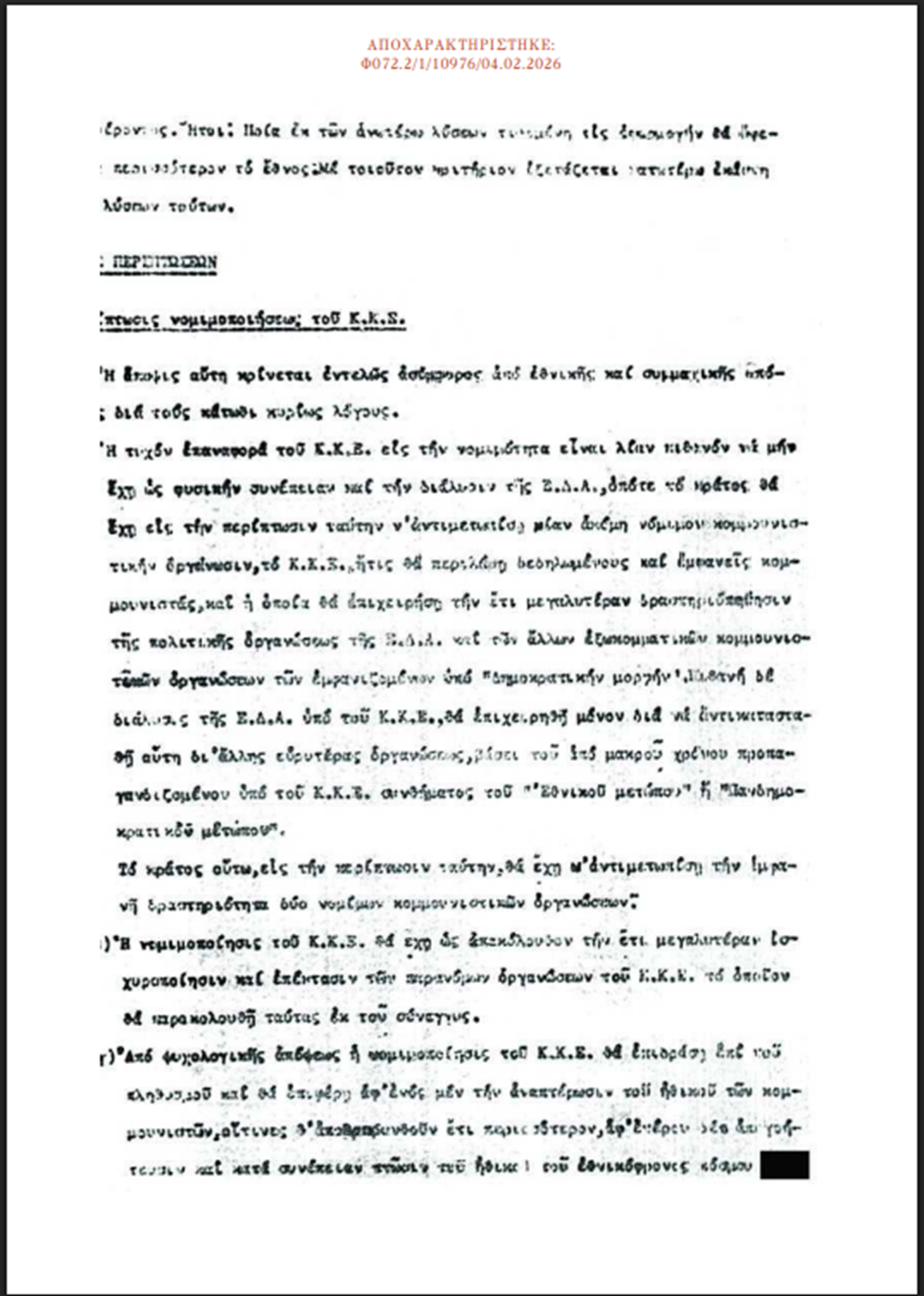 Ακόμη, τονίζει ότι το ΚΚΕ δεν πρέπει να νομιμοποιηθεί, ενώ υμνεί τις ελληνικές πολιτικές στο Κυπριακό, επειδή με αυτόν τον τρόπο «μειώθηκε η κομμουνιστική απειλή» στο εσωτερικό της Ελλάδας.