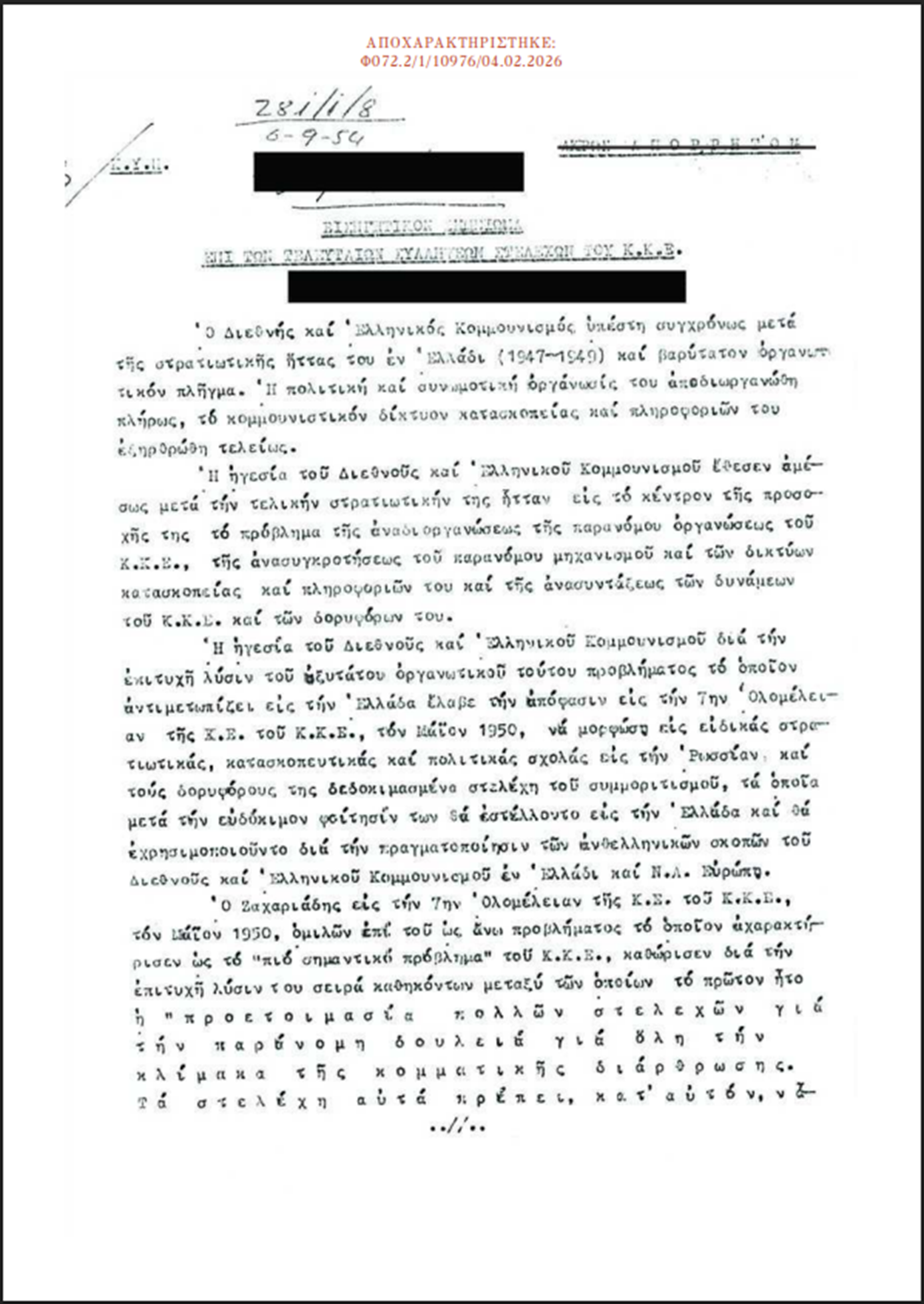 Στο πλαίσιο αυτό, δίνονται σήμερα στη δημοσιότητα 123 έγγραφα, συνολικής έκτασης περίπου 2.000 σελίδων, από τα πρώτα χρόνια λειτουργίας της Υπηρεσίας, καλύπτοντας την περίοδο από το 1953 έως και το 1959.