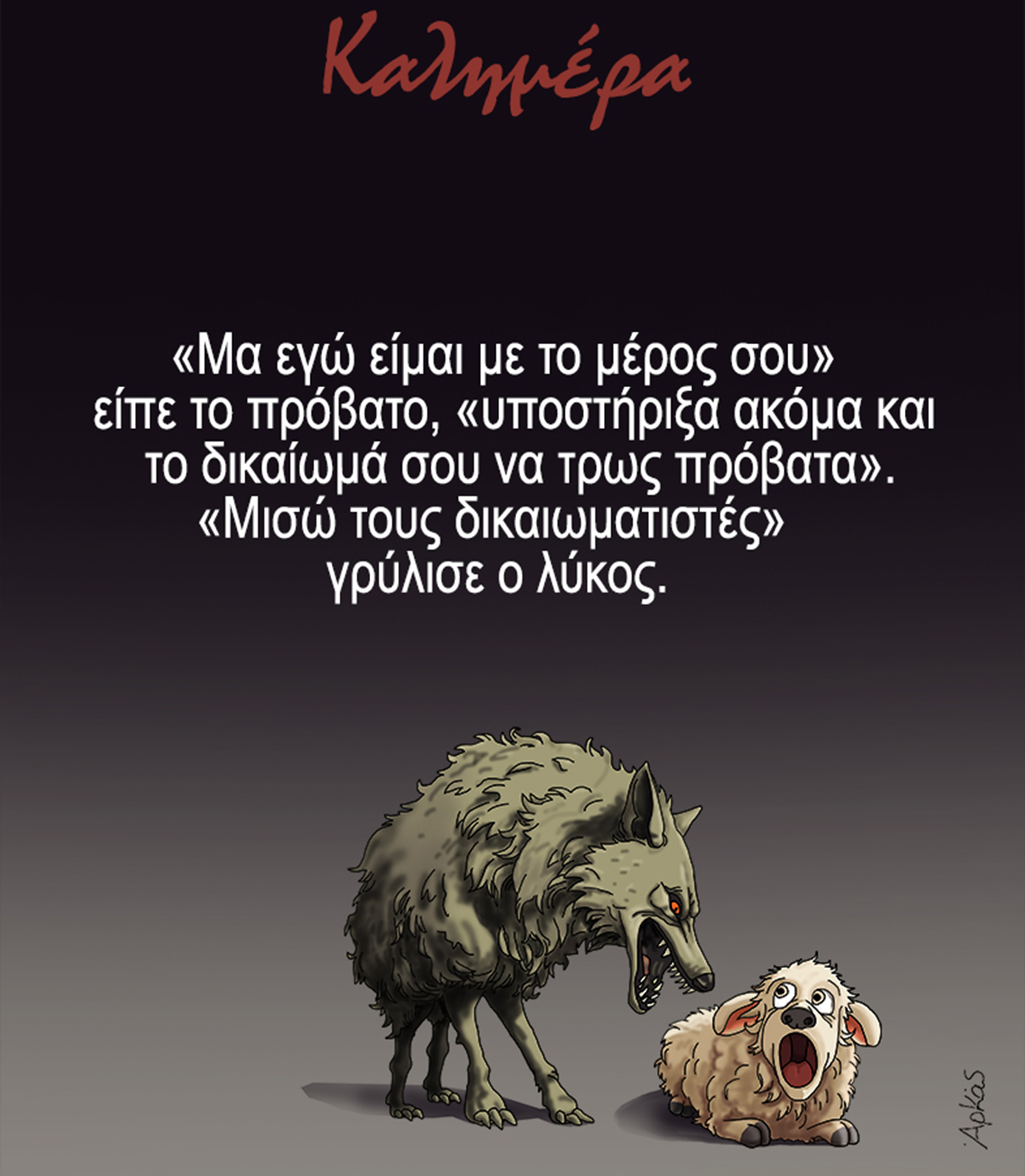 Το σκίτσο σχολιάζει με αιχμηρό τρόπο τη σχέση δύναμης, υποκρισίας και δικαιωμάτων, αναδεικνύοντας τη διαρκή ένταση ανάμεσα σε εκείνους που προσπαθούν να υπερασπιστούν αρχές και αξίες και σε όσους κινούνται μόνο με γνώμονα το συμφέρον και την ισχύ τους. Μέσα από την αλληγορία του λύκου και του προβάτου, ο Αρκάς δείχνει ότι η καλή πρόθεση και η υποστήριξη ενός δικαιώματος δεν αρκούν όταν η άλλη πλευρά δεν αναγνωρίζει ούτε καν τα βασικά όρια, λειτουργώντας αποκλειστικά με γνώμονα την αυτοεπιβίωση και την επιβολή.