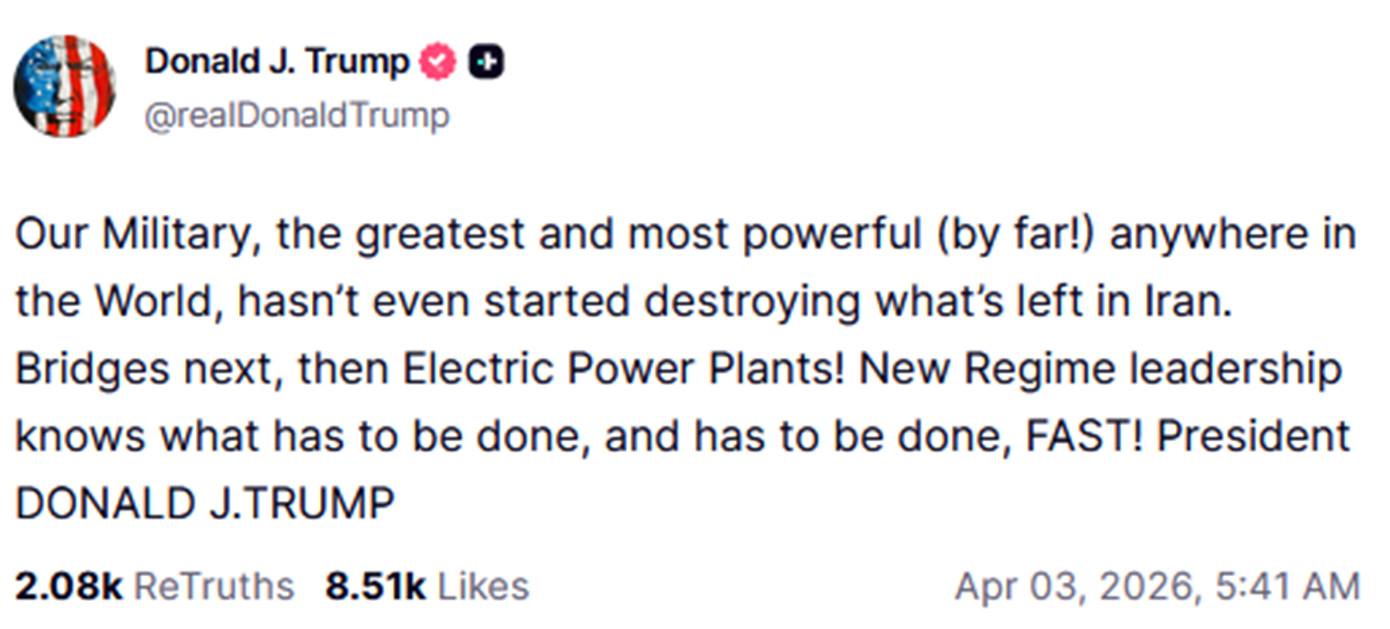 Νέες απειλές εξαπέλυσε ο πρόεδρος των ΗΠΑ, Ντόναλντ Τραμπ, προειδοποιώντας τις πρώτες πρωινές ώρες σήμερα ότι θα καταστραφούν κι άλλες πολιτικές υποδομές στο Ιράν, αναφερόμενος συγκεκριμένα σε γέφυρες και ηλεκτροπαραγωγικούς σταθμούς.