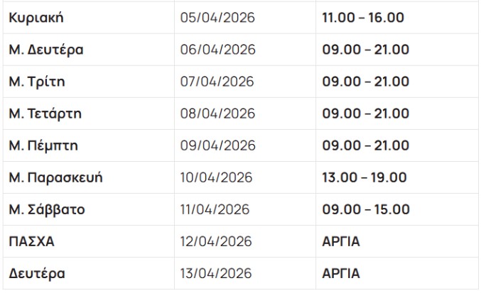 - Τη Μεγάλη Παρασκευή 10/4, τα καταστήματα θα λειτουργήσουν από τις 13:00 έως τις 19:00, ενώ το Μεγάλο Σάββατο 1/4 από τις 10:00 έως τις 16:00.