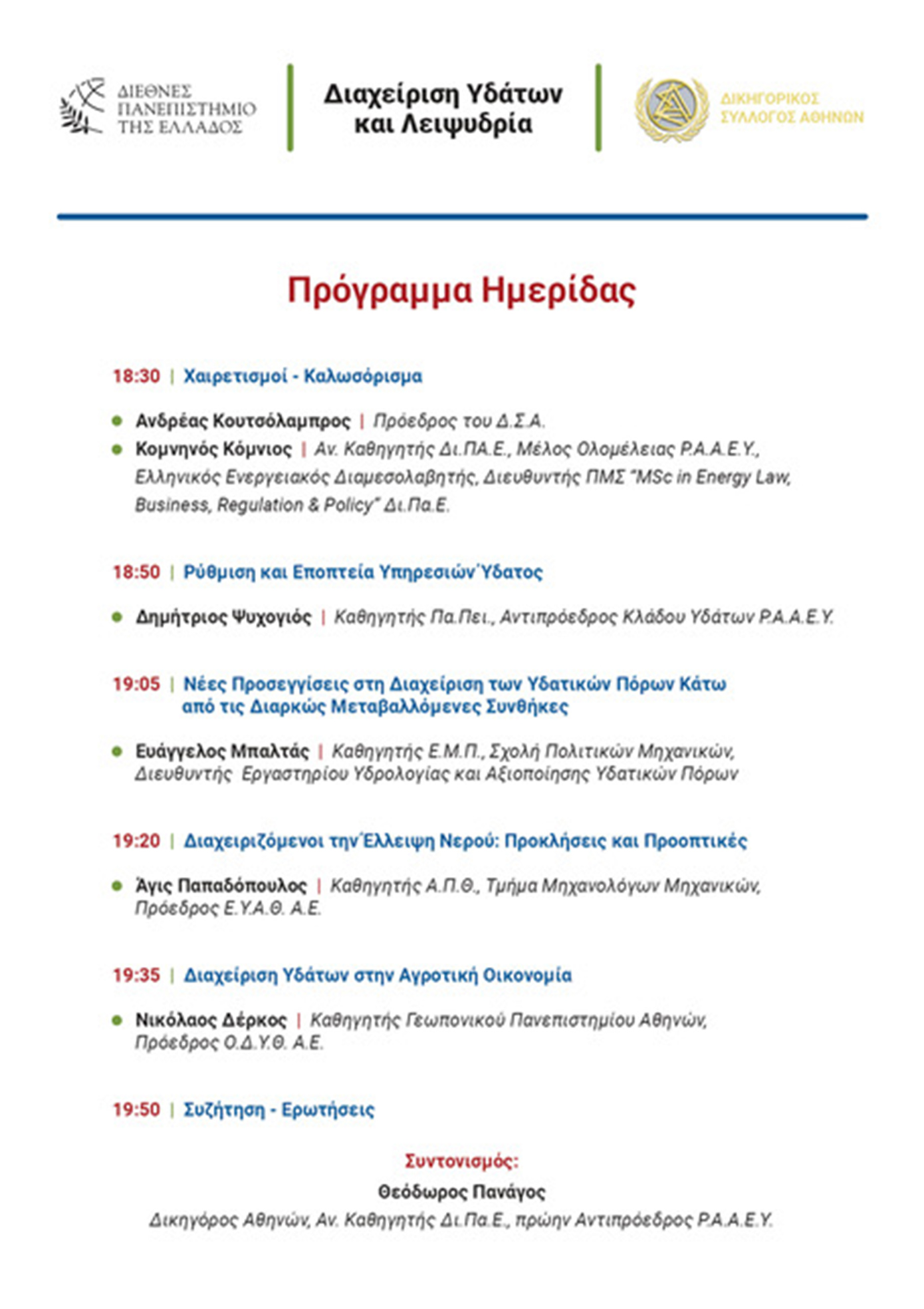 «Διαχείριση υδάτων και λειψυδρία» είναι το θέμα επιστημονικής εκδήλωσης που οργανώνεται από τον Δικηγορικό Σύλλογο Αθηνών και το Διεθνές Πανεπιστήμιο Ελλάδος. Η εκδήλωση θα διεξαχθεί τη Δευτέρα 27 Απριλίου 2026, στις 18:30, στον Δικηγορικό Σύλλογο Αθηνών και εισηγητές είναι οι πλέον έγκριτοι πανεπιστημιακοί του τομέα.