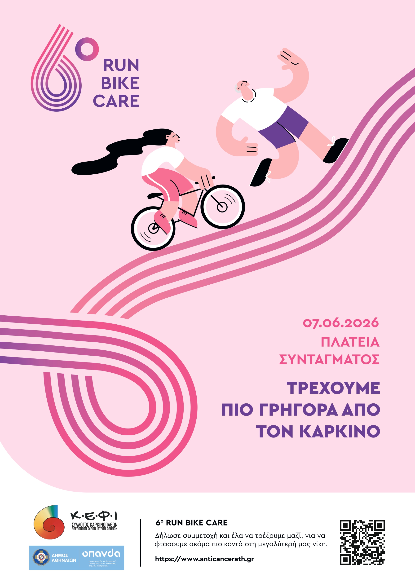 Ο Σύλλογος Καρκινοπαθών Εθελοντών – Φίλων Ιατρών «Κ.Ε.Φ.Ι.» Αθηνών διοργανώνει για έκτη συνεχόμενη χρονιά τον αγώνα – θεσμό RUN – BIKE – CARE, την Κυριακή 7 Ιουνίου και ώρα συγκέντρωσης 08.15, στο κέντρο της Αθήνας, στην Πλατεία Συντάγματος αλλά και σε άλλες πόλεις της Ελλάδας όπως το Γύθειο και τους Γαργαλιάνους. Με κεντρικό μήνυμα «Τρέχουμε πιο γρήγορα από τον καρκίνο» και αφορμή την Παγκόσμια Ημέρα Επιζώντων του Καρκίνου, χιλιάδες ποδηλάτες, δρομείς και περιπατητές θα πραγματοποιήσουν για 6η χρονιά μια ευχάριστη βόλτα στο κέντρο της Αθήνας. Ο αγώνας έχει ως στόχο την αφύπνιση και ευαισθητοποίηση, ενώνοντας τις φωνές όλων των ανθρώπων που έχουν ζήσει μια εμπειρία καρκίνου.