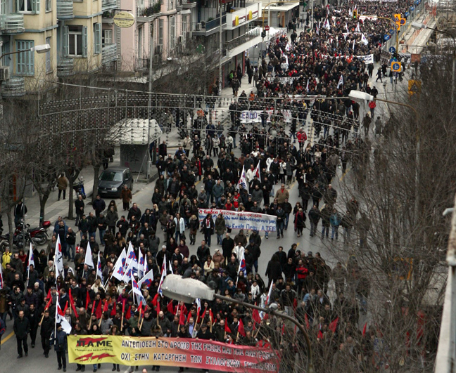 Μέλη των «πρωτοβάθμιων σωματείων ιδιωτικού και δημοσίου τομέα» και φοιτητές, μετά την πορεία έκλεισαν την Εγνατία Οδό, στο άγαλμα του Βενιζέλου, ως τις τέσσερεις το απόγευμα.