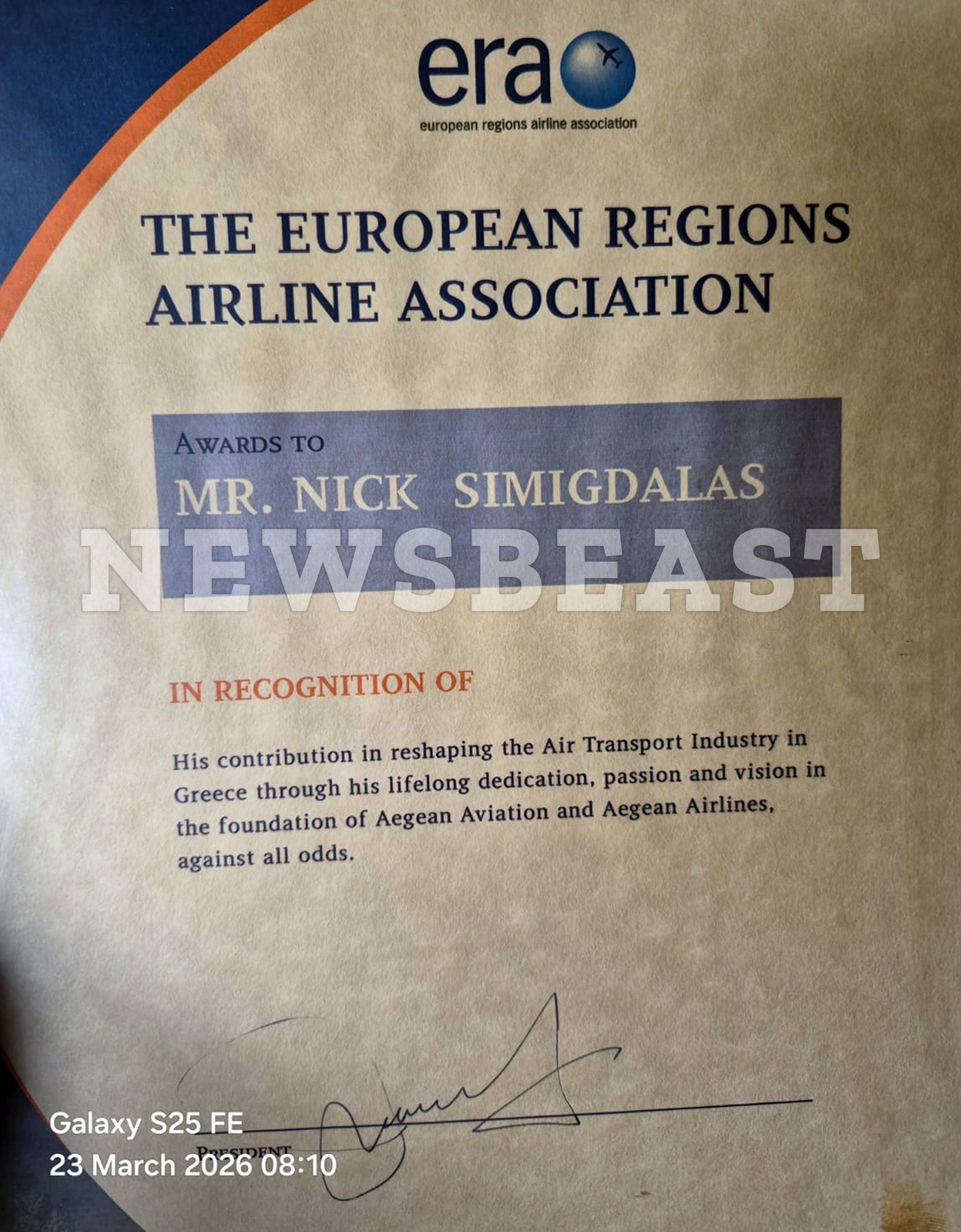Πρόκειται για το τρίτο πακέτο απελευθέρωσης των αερομεταφορών σε όλη την Ευρώπη. Το οποίο ψηφίστηκε το 1991, την εποχή του Μαάστριχτ. Στις 17 Φεβρουαρίου του 1992 η μικρή εταιρεία που ονομάστηκε “Αεροπορία Αιγαίου” του Νίκου και του Αντώνη Συμιγδαλά πήρε την πρώτη άδεια αερομεταφορών που εκδόθηκε στην Ελλάδα. Το αρχικό σήμα της εταιρείας παραμένει μέχρι το 2020 το ίδιο θα έλεγα, με κάποιες μικρές διαφοροποιήσεις. Από το 1988 μέχρι και το 2020, γιατί έχω φύγει από την “Aegean” από το 2009, η τότε διοίκηση, άλλαξε το σήμα με αυτό που υπάρχει σήμερα στις ουρές των αεροσκαφών της εταιρείας. Όσο για το προηγούμενο σήμα έχει και μια ιδιαίτερη σημειολογία που θα μου επιτρέψετε να αναφέρω: απεικονίζει δυο γλάρους, έναν μεγάλο και ένα μικρό. Πρόκειται για ένα παλαιό ανεμοπορικό σήμα, τη διάκριση “τύπου Β’” όπου μεταφορικά ο μεγάλος γλάρος είναι ο Νίκος Συμιγδαλάς και ο μικρός είναι ο Αντώνης Συμιγδαλάς».