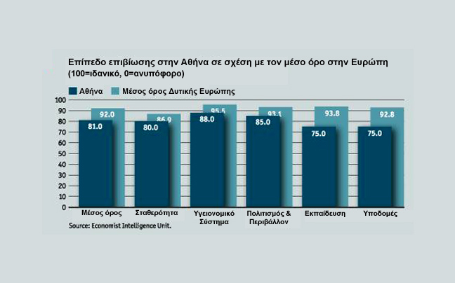 Η εκπαίδευση είναι σε κακό επίπεδο, ενώ οι υποδομές, ειδικά στο οδικό δίκτυο είναι τα «μελανά σημεία» στην Αθήνα. Σε παγκόσμιο επίπεδο η Αθήνα καταλαμβάνει την 63η θέση, κάτω από το Ταπέι και το Μπουένος Άιρες, ενώ μετά την ελληνική πρωτεύουσα ακολουθεί το Σαντιάγο της Χιλής. Την πρωτιά έχει το Βανκούβερ του Καναδά.
