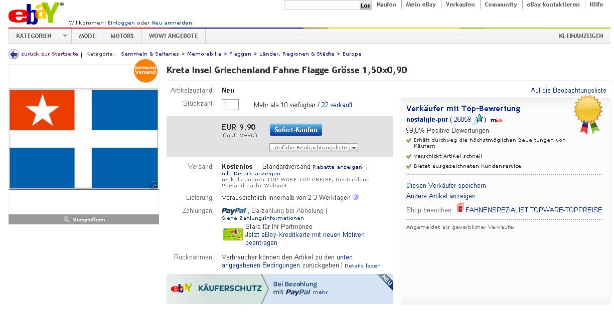 Στην παρακάτω εικόνα βλέπετε την ιστοσελίδα γνωστού γερμανικού ηλεκτρονικού καταστήματος το οποίο πουλά την σημαία της ανεξάρτητης Κρήτης, αναφερόμενη σ’ αυτήν, ως η ιστορική σημαία της Κρήτης από το έτος 1912 με διαστάσεις 1,5 μ. και 0,9μ !!!