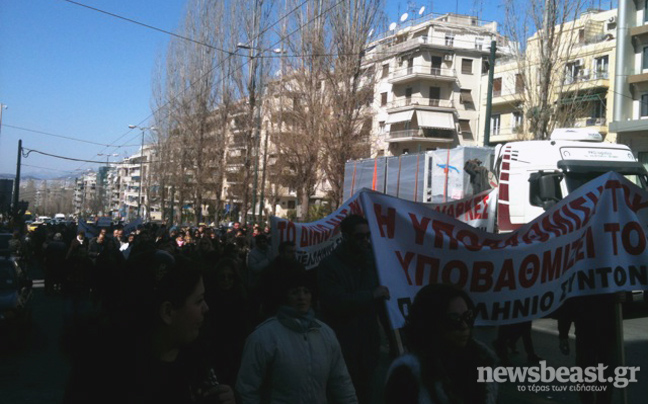 Οι συμβασιούχοι συγκεντρώθηκαν νωρίς το πρωί στο Πνευματικό Κέντρο του δήμου Αθηναίων και στη συνέχεια κατευθύνθηκαν στα γραφεία του ΠΑΣΟΚ όπου σημειώθηκε ένταση με τα ΜΑΤ που μπλόκαραν τη πορεία τους.