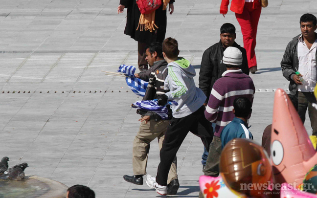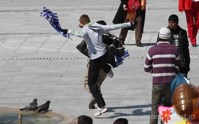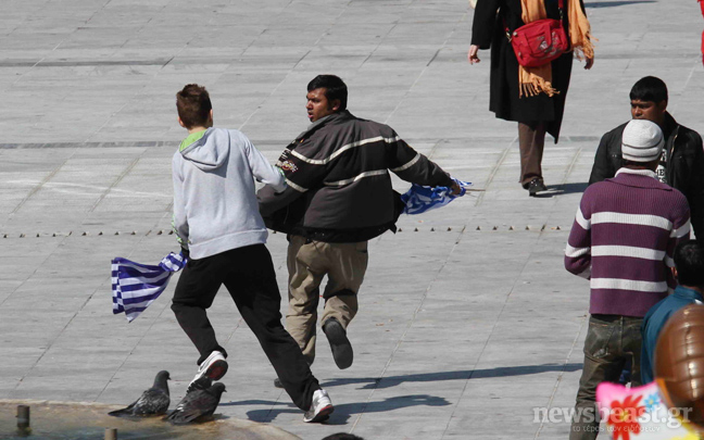 Με σύνθημα «Η Ελλάδα δεν πωλείται» κυνηγήθηκαν από μερίδα πολιτών στην πλατεία Συντάγματος οι μετανάστες που πουλούσαν ελληνικές σημαίες. Ιδιαίτερη εντύπωση, εκτός από την πράξη βίας, κάνει και το νεαρό της ηλικίας του πιτσιρικά της φωτογραφίας που πρωταγωνιστεί στο επεισόδιο.