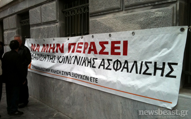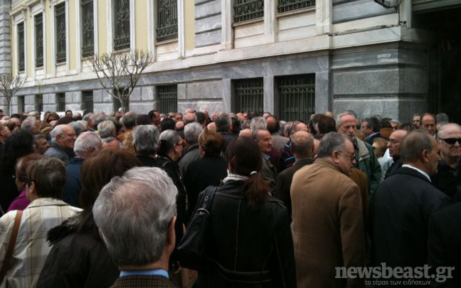 Οι συνταξιούχοι παραμένουν έξω από το κτίριο και φωνάζουν συνθήματα κατά της διοίκησης.