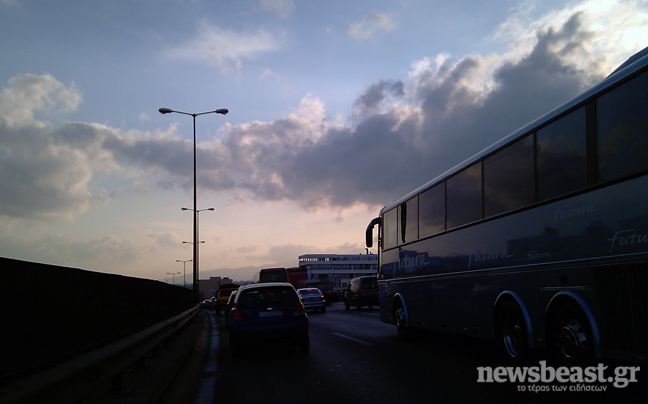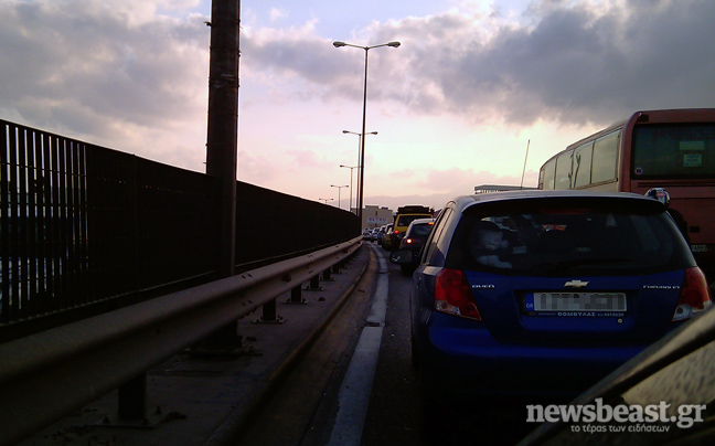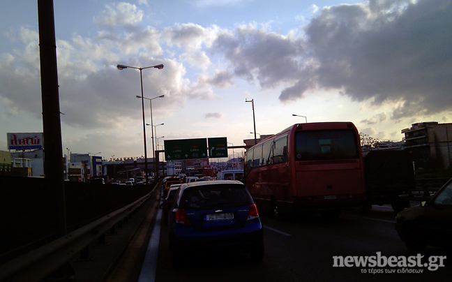 Με πολύ χαμηλές ταχύτητες κινούνται τα οχήματα στο ρεύμα ανόδου της εθνικής οδού από το ύψος των ΚΤΕΛ έως τη Μεταμόρφωση.