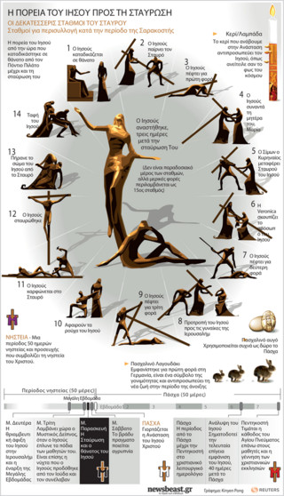 Οι Ρωμαίοι επιβάλουν στον Σίμωνα τον Κυρηναίο, που διερχόταν από εκείνο το σημείο, να μεταφέρει αυτός τον Σταυρό του Μαρτυρίου. Τελικά στις 9 η ώρα το πρωί, ο Ιησούς σταυρώνεται. Το μαρτύριο του Χριστού κράτησε έξι ώρες. Στις 3 η ώρα το απόγευμα παρέδωσε το πνεύμα Του, αφού προηγουμένως είχε συγχωρήσει όσους ευθύνονταν για τον θάνατο Του.