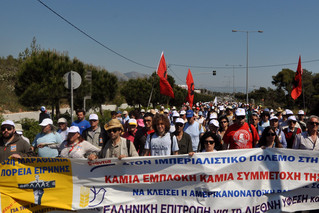 Η πορεία ξεκίνησε στις 8 το πρωί από τον Τύμβο του Μαραθώνα με αιτήματα την «καταδίκη των ιμπεριαλιστικών πολέμων και επεμβάσεων» και «του ιμπεριαλιστικού πολέμου στη Λιβύη», «τον τερματισμό οποιασδήποτε ελληνικής εμπλοκής», «το κλείσιμο της αμερικανοΝΑΤΟικής βάσης στη Σούδα» και βεβαίως για «την ειρήνη, τη φιλία και την αλληλεγγύη των λαών».