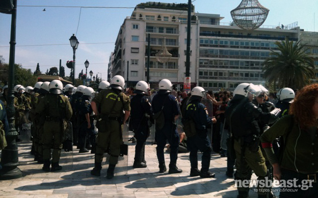 Υπό την επιτήρηση των ανδρών των ΜΑΤ βρίσκονται περίπου 30 άτομα που βρίσκονται συγκεντρωμένα αυτή τη στιγμή στην πλατεία Συντάγματος. Οι αστυνομικοί βρίσκονται σε επιφυλακή υπό το φόβο νέων επεισοδίων.