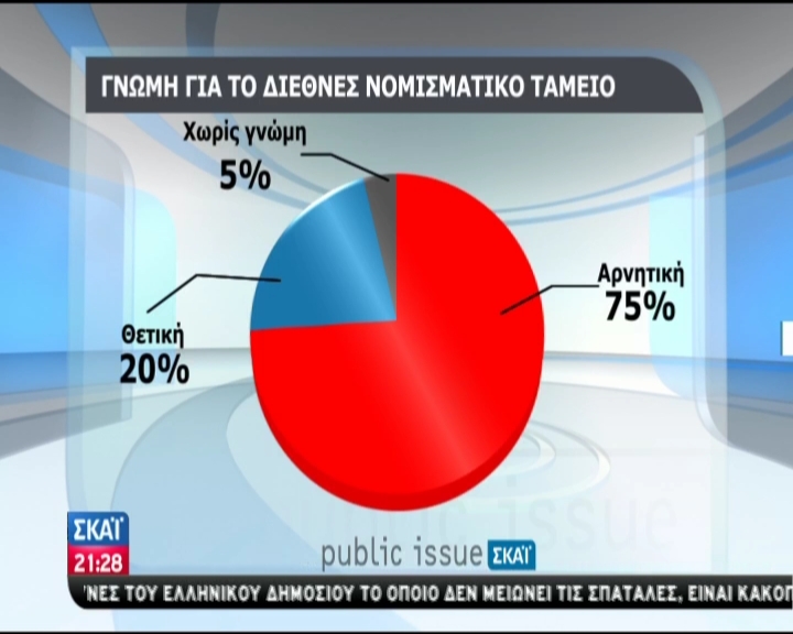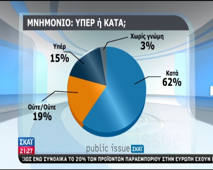 Από τη μία η κυβέρνηση θεωρεί μονόδρομο το Μνημόνιο για την οικονομική σωτηρία της χώρα μας, από την άλλη οι Έλληνες δεν θέλουν ούτε το Μνημόνιο ούτε το ΔΝΤ. Αρνητική είναι η στάση του ελλήνων πολιτών όπως αποκαλύπτει δημοσκόπηση της Public Issue για τον ΣΚΑΙ.