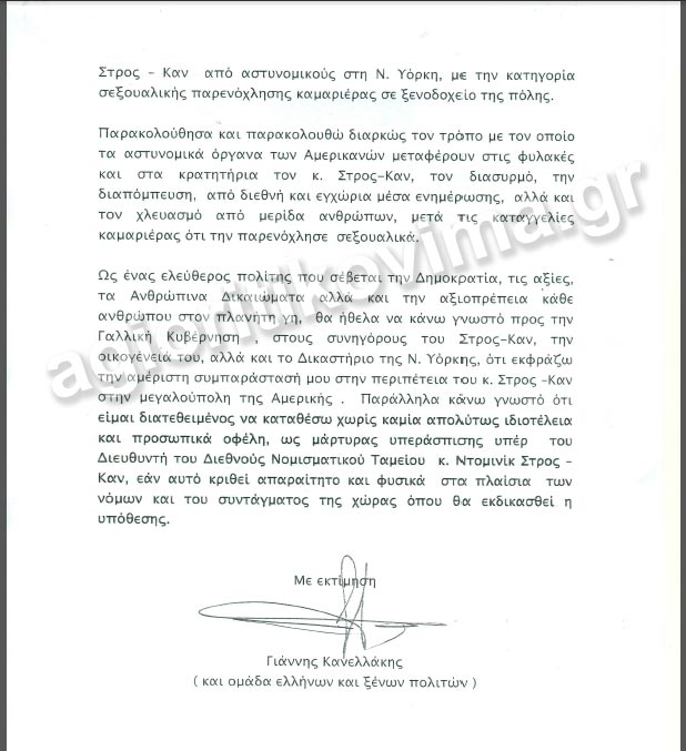 Επιστολή συμπαράστασης για τον διασυρμό, όπως υποστηρίζει, του πρώην επικεφαλής του ΔΝΤ, έστειλε ο δημοσιογράφος Γιάννης Κανελλάκης, μέσω της Γαλλικής πρεσβείας, στην οικογένεια και στους συνηγόρους του πρώην ισχυρού άνδρα του διεθνούς νομισματικού ταμείου. Μεταξύ άλλων κάνει λόγο για καταπάτηση των ανθρωπίνων δικαιωμάτων και της αξιοπρέπειας του πολίτη και προσφέρεται να καταθέσει ως μάρτυρας υπεράσπισης του κ. Καν.
