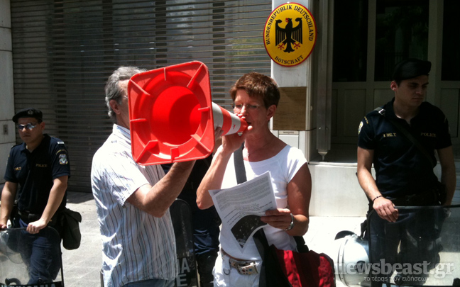 Συγκέντρωση έξω από την πρεσβεία της Γερμανίας στο Κολωνάκι πραγματοποιούν αυτή την ώρα ομάδα Γερμανών πολιτών αλλά και Έλληνες, με αίτημα την καταβολή των γερμανικών αποζημιώσεων. Στη συγκέντρωση μετέχουν Γερμανοί που ζουν στην Ελλάδα, καθώς και Γερμανοί πολίτες που ταξίδεψαν από τη χώρα τους για να λάβουν μέρος στην κινητοποίηση.