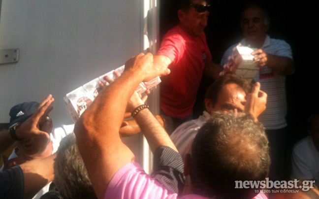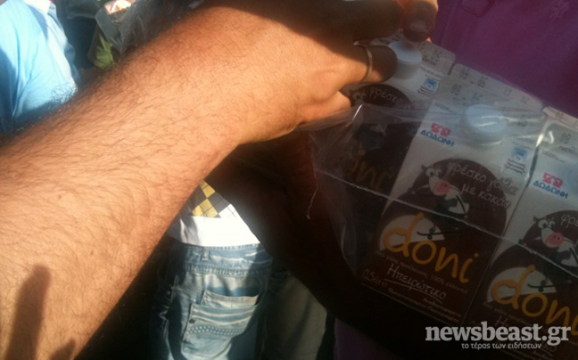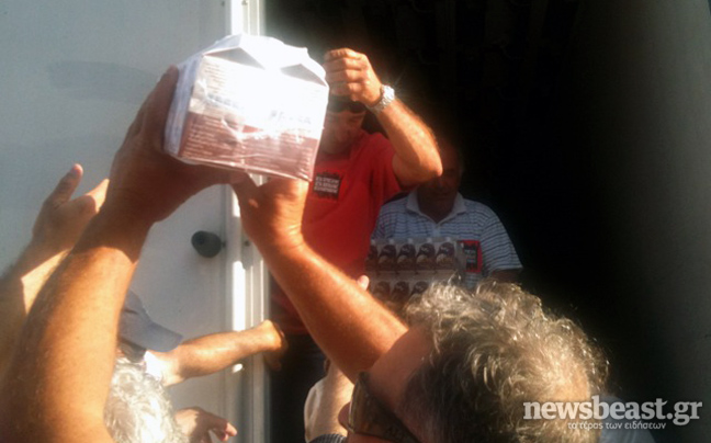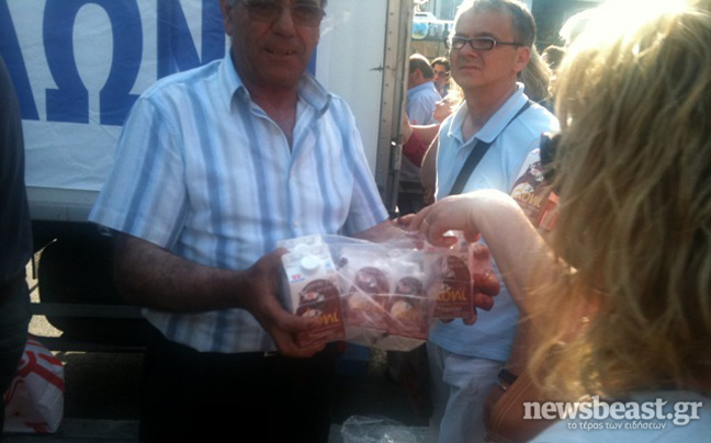 Συσκευασίες γάλακτος μοιράζουν εργαζόμενοι της γαλακτοβιομηχανίας «Δωδώνη» σε «αγανακτισμένους» και πολίτες που βρίσκονται στην πλατεία Συντάγματος, διαμαρτυρόμενοι για το ενδεχόμενο πώλησής της.