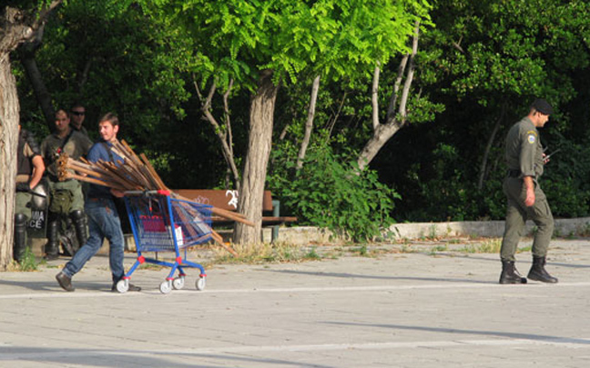 Επίσης, ερωτήματα δημιουργεί φωτογραφία που δείχνει άντρα με πολιτικά να μεταφέρει σε καροτσάκι σούπερ μάρκετ ξύλα, ρόπαλα και… πολεμικό υλικό, δίπλα από άνδρες των ΜΑΤ.
