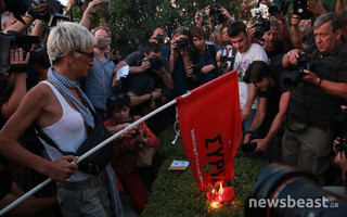 Όπως πιστοποιούν και οι φωτογραφίες από τη συγκέντρωση στο κέντρο της Αθήνας, ενάντια στη συμφωνία που υπέγραψε η κυβέρνηση με τους Ευρωπαίους εταίρους, μια διαδηλώτρια καίει την σημαία του ΣΥΡΙΖΑ. Νωρίτερα, ένας οπαδός του κυβερνόντος κόμματος επιχείρησε να εμποδίσει την πράξη της, εκείνη ωστόσο απάντησε ότι έχει δικαίωμα να κάψει ότι θέλει. Το περιστατικό σημειώθηκε έξω από το Μνημείο του Αγνώστου Στρατιώτη, στο Σύνταγμα.