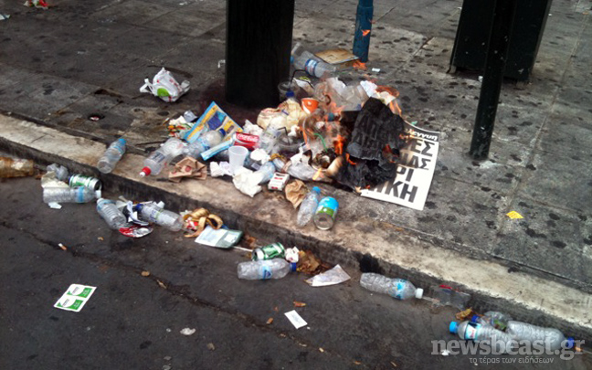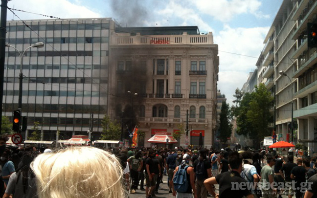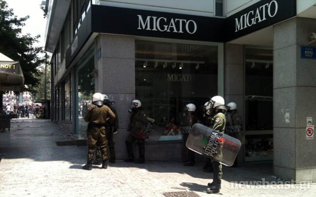 Η Ερμού, η Καραγιώργη Σερβίας, η Σταδίου και η Βουκουρεστίου έχουν μετατραπεί σε πεδίο μάχης με τους κουκουλοφόρους να σπάνε ότι βρουν μπροστά τους και να πετούν βόμβες μολότοφ και πέτρες εναντίον αστυνομικών, οι οποίοι απαντούν τους με χρήση δακρυγόνων.
