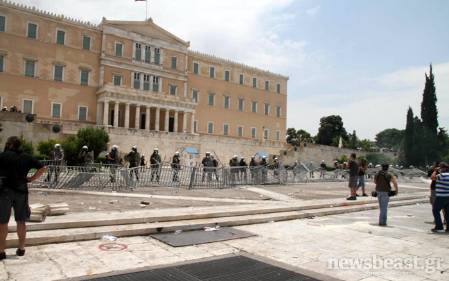 Έκρυθμη παραμένει η κατάσταση στην πλατεία Συντάγματος και στους γύρω δρόμους. Τα επεισόδια έχουν ξεκινήσει εδώ και περίπου τρεις ώρες και δεν έχουν σταματήσει ούτε λεπτό.