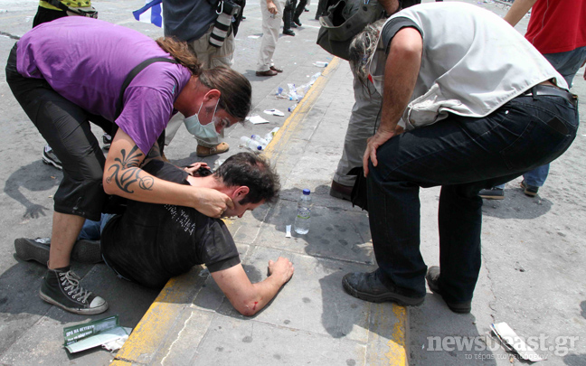 Εν τω μεταξύ συνεχίζουν να ακούγονται διαρκώς κρότοι από δακρυγόνα.Στις 16:00 ένταση δημιουργήθηκε όταν τραυματισμένος αστυνομικός, υποβασταζόμενος από συναδέλφους του επιχείρησε να περάσει μέσα από το ειδικό φράγμα που έχει στήσει μπροστά από την παράπλευρη είσοδο της Βουλής η αστυνομία, για να δεχτεί τις πρώτες βοήθειες. Διαδηλωτής που βρισκόταν έξω από την πρεσβεία της Αιγύπτου και ακριβώς δίπλα από το φράγμα φώναξε «περαστικά» και κατόπιν άντρας των ΜΑΤ κινήθηκε εναντίον του. Με την παρέμβαση των ψυχραιμότερων αποφεύχθηκαν τα χειρότερα.