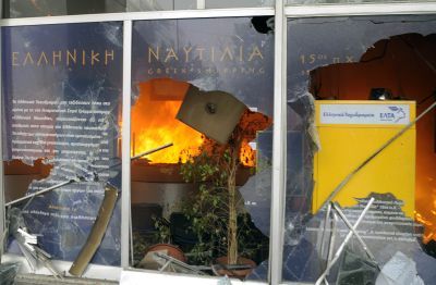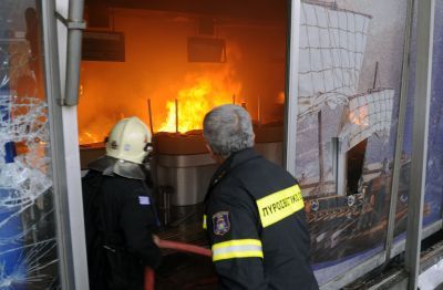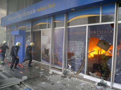 Οι μολότοφ πέφτουν βροχή στο Σύνταγμα με αποτέλεσμα τα ΕΛ.ΤΑ., κάτω από το υπουργείο Οικονομικών, να πιάσουν φωτιά. Οι πυροσβεστικές δυνάμεις δεν μπορούν να πλησιάσουν στο σημείο που διαδραματίζονται τα γεγονότα και οι αστυνομικές δυνάμεις ετοιμάζουν επιχείρηση για να «καθαρίσει» η περιοχή.