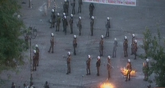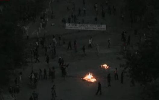 Τα επεισόδια συνεχίζονται κατά διαστήματα στο κέντρο της Αθήνας, ενώ αυτήν την ώρα σιγοκαίνε στο μέσο της πλατείας Συντάγματος φωτιές από βόμβες μολότοφ που έπεσαν λίγο νωρίτερα.