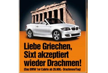 «Αγαπητοί Έλληνες, δεχόμαστε ξανά δραχμές. Το BMW1 κάμπριο από 26.900 δρχ. την ημέρα», είναι το κείμενο που συνοδεύει φωτογραφία του συγκεκριμένου αυτοκινήτου με το σήμα της Sixt.