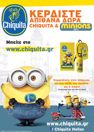 Η Chiquita πραγματοποιεί μεγάλο online διαγωνισμό μέσω του www.chiquita.gr. Δικαίωμα συμμετοχής έχουν όλοι οι κάτοικοι Ελλάδας 13 ετών και άνω. Για τη συμμετοχή στο διαγωνισμό, δεν απαιτείται αγορά προϊόντος. Ο διαγωνισμός χαρίζει δώρα άμεσης νίκης (instant win) και συμμετοχή στην κλήρωση για το μεγάλο δώρο! Μπαίνετε στο www.chiquita.gr στο πεδίο του διαγωνισμού. Δίνετε τα στοιχεία σας και βλέπετε επιτόπου αν έχετε κερδίσει κάποιο δώρο άμεσης νίκης, με τα Minions. Όλοι οι συμμετέχοντες μπαίνουν στην κλήρωση για το μεγάλο δώρο που είναι ένα ταξίδι στο Λονδίνο για 4 άτομα. Επιτρέπονται πολλαπλές συμμετοχές στο διαγωνισμό, καθώς κάθε ένας μπορεί να συμμετέχει μία φορά την ημέρα, από τις 8.00 π.μ. έως τις 23.00 μ.μ. Η διάρκεια του διαγωνισμού είναι 15/09-20/10. Η κλήρωση θα γίνει στις 02/11/15. Οι μπανάνες Chiquita αυτήν την περίοδο κυκλοφορούν με αυτοκόλλητα με τους ήρωες της ταινίας Minions. Περισσότερες πληροφορίες και συμμετοχή στο διαγωνισμό εδώ.