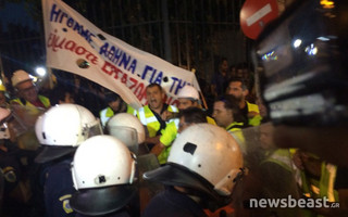 Οι άνδρες των ΜΑΤ επιχειρούν να τους απωθήσουν μακριά από την είσοδο, αφού σε λίγη ώρα θα φθάσουν οι πολιτικοί αρχηγοί στο κτίριο.