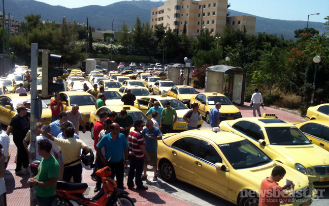 Εκατοντάδες ταξί παραμένουν παραταγμένα έξω από του υπουργείο ενώ οι ίδοι οι απεργοί μιλούν για τρεις χιλιάδες οχήματα.