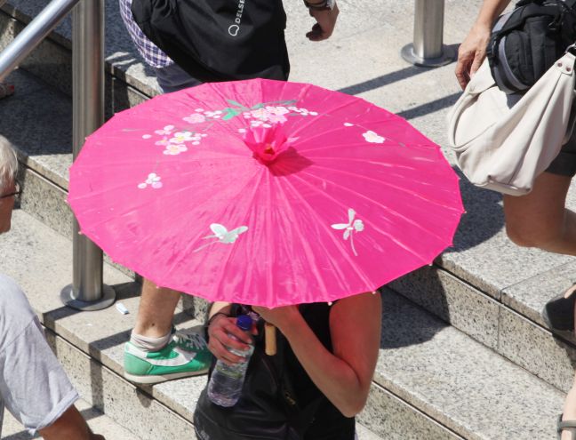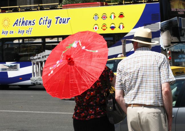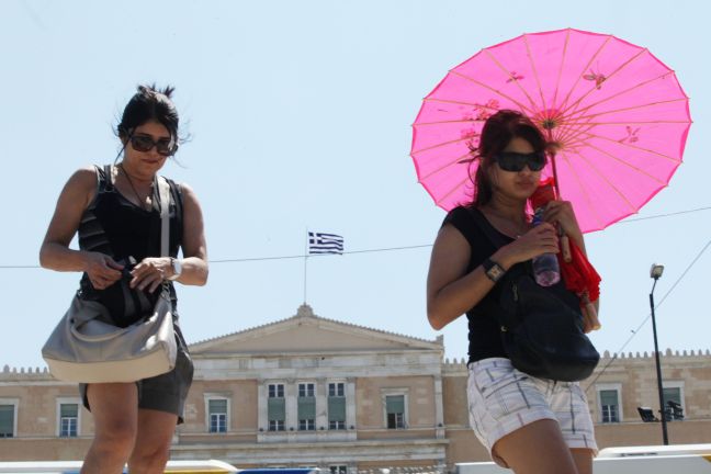 Με ροζ ομπρέλα και σορτσάκια δύο τουρίστριες… καταπολεμούν τον καύσωνα
