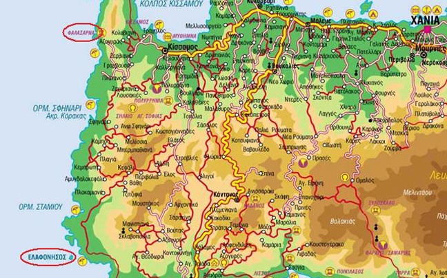 Το Ελαφονήσι απέχει 76 χλμ.από τα Χανιά και 43 από το Καστέλι. Εδώ έρχεται κανείς για να θαυμάσει τις εκπληκτικές αμμουδερές παραλίες με τους αμμόλοφους και τη λευκή άμμο και να κολυμπήσει στα μοναδικά σε όλη την Κρήτη κρυστάλλινα νερά.