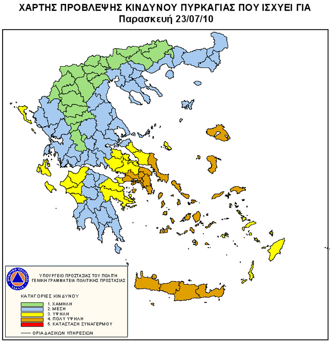 Αυτοδιοίκησης να βρίσκονται σε αυξημένη ετοιμότητα προκειμένου να αντιμετωπίσουν άμεσα τυχόν επεισόδια πυρκαγιών. Η προειδοποίηση αφορά κυρίως την Ανατολική και Δυτική Αττική, τον Πειραιά, την Εύβοια, τις Κυκλάδες, τη Λέσβο, τη Χίο, την Κρήτη (Ηράκλειο, Λασίθι, Ρέθυμνο και Χανιά).