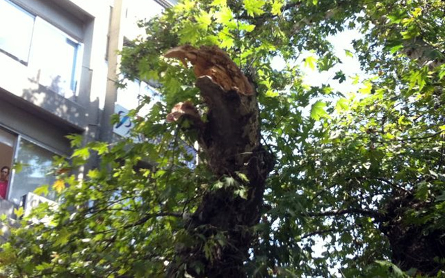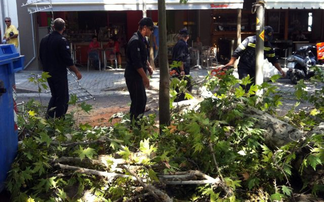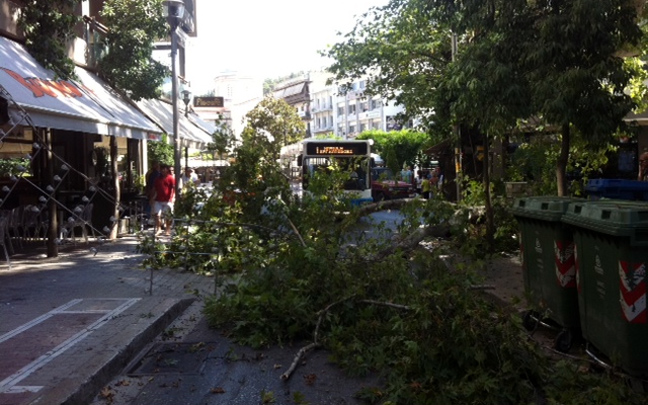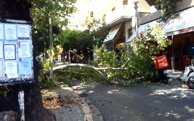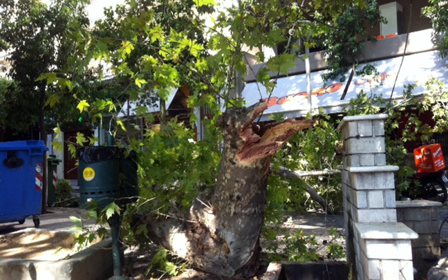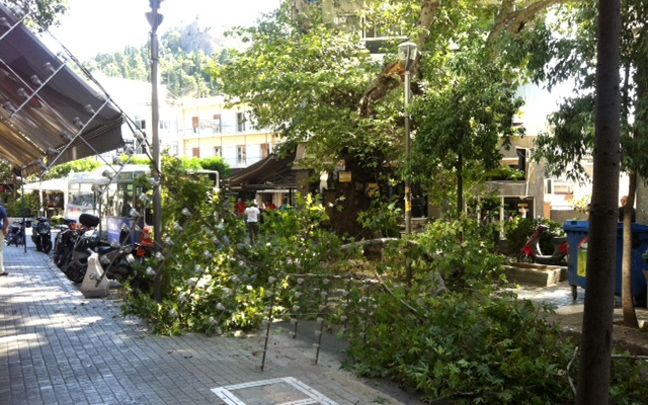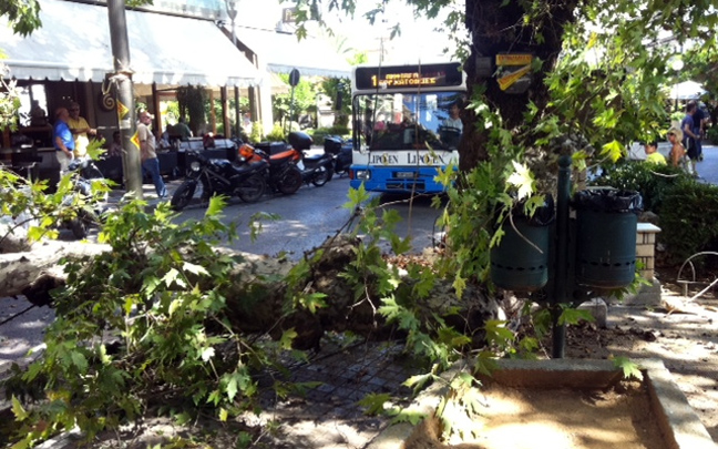 «Έπινα καφέ και άκουσα έναν ήχο -κρακ-κρακ-και ξαφνικά έσπασε ο πλάτανος. Τα κλωνάρια έφτασαν μέχρι τα τραπεζάκια» λέει ένας αυτόπτης μάρτυρας. Λίγα λεπτά νωρίτερα βρισκόταν στο σημείο ένα αυτοκίνητο που πρόλαβε να φύγει πριν πέσει κομμάτι από το δέντρο.