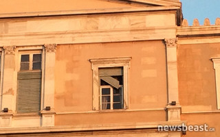 Όπως φαίνεται στις παρακάτω φωτογραφίες, το κάλυμμα του συγκεκριμένου παράθυρου έχει σπάσει, ξεχωρίζοντας από τα υπόλοιπα στο κτίριο της Βουλής.