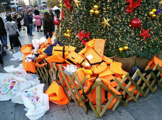 Γέμισε σωσίβια η βάση του χριστουγεννιάτικου δέντρου στην πλατεία Συντάγματος, το απόγευμα της Κυριακής.