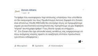 «Τα άρθρα που κυκλοφορούν περί απόλυσης υπαλλήλου που υποτίθεται οτι δεν αναγνώρισε τον τέως Πρωθυπουργό Αντώνη Σαμαρά στο Zonars είναι απολύτως Ψευδή !!!!Επειδή δεν συντρέχει λόγος να προχωρήσουμε νομικά για ανυπόστατα κουτσομπολιά σας προτρέπουμε να μην διαβάζετε “κίτρινα” ανυπόγραφα άρθρα ! Τους δίνεται τροφή να υπάρχουν ….