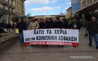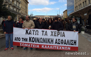 Συγκέντρωση και πορεία διαμαρτυρίας πραγματοποιούν οι καλλιτέχνες ενάντια στο Ασφαλιστικό, καταγγέλλοντας ότι ο καλλιτεχνικός χώρος είναι από τους πιο εκτεθειμένους στις συνέπειες της κρίσης.