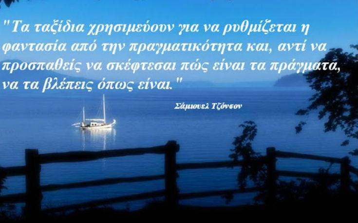Κάποια μας εμπνέουν και μας προτρέπουν να ταξιδέψουμε τώρα. Άλλα μας βάζουν σε σκέψεις για το τι μπορεί να σημαίνει το ταξίδι. Δεν είναι λίγα εκείνα που συνδέουν άρρηκτα το ταξίδι με τον εσωτερικό μας κόσμο και την αναζήτηση του είναι μας. Ακολουθούν κάποια από τα ταξιδιωτικά αποφθέγματα που μας έκαναν να τα ξεχωρίσουμε, τόσο για το περιεχόμενο όσο και για το νόημά τους.