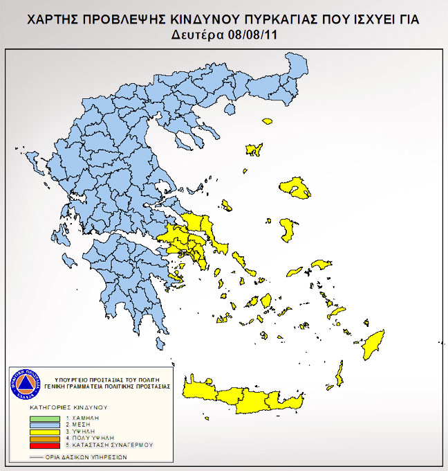 Υψηλό κίνδυνο πυρκαγιάς αντιμετωπίζουν σήμερα Αττική και Βοιωτία, η νότια Εύβοια, η Κρήτη, οι Κυκλάδες, η Σκύρος και τα νησιά του βορειοανατολικού Αιγαίου.